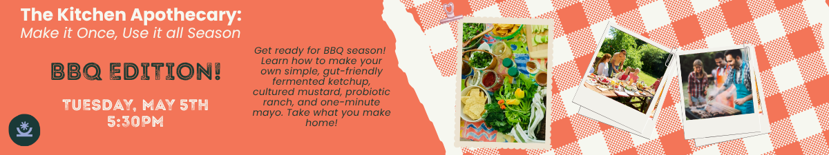 This month's class is the Backyard Apothecary—BBQ Edition! We’re getting ready for summer with fermented ketchup, cultured mustard, probiotic ranch (made with Greek yogurt), and one-minute mayo. Simple, gut-friendly staples are made in class and they're yours to keep. Leave feeling confident recreating these recipes at home!